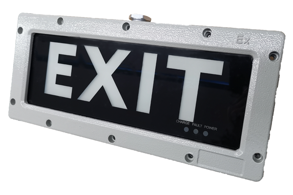 Key Specifications: Light gray metal housing with black panel displaying white uppercase "EXIT" lettering, "CHARGE FAULT POWER" status indicators with three LEDs at bottom right, top metal knob, "Ex" explosion-proof marking on right side.